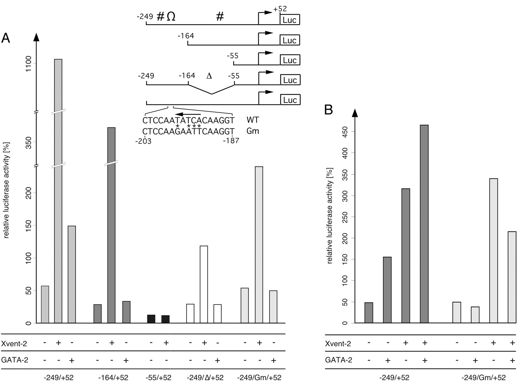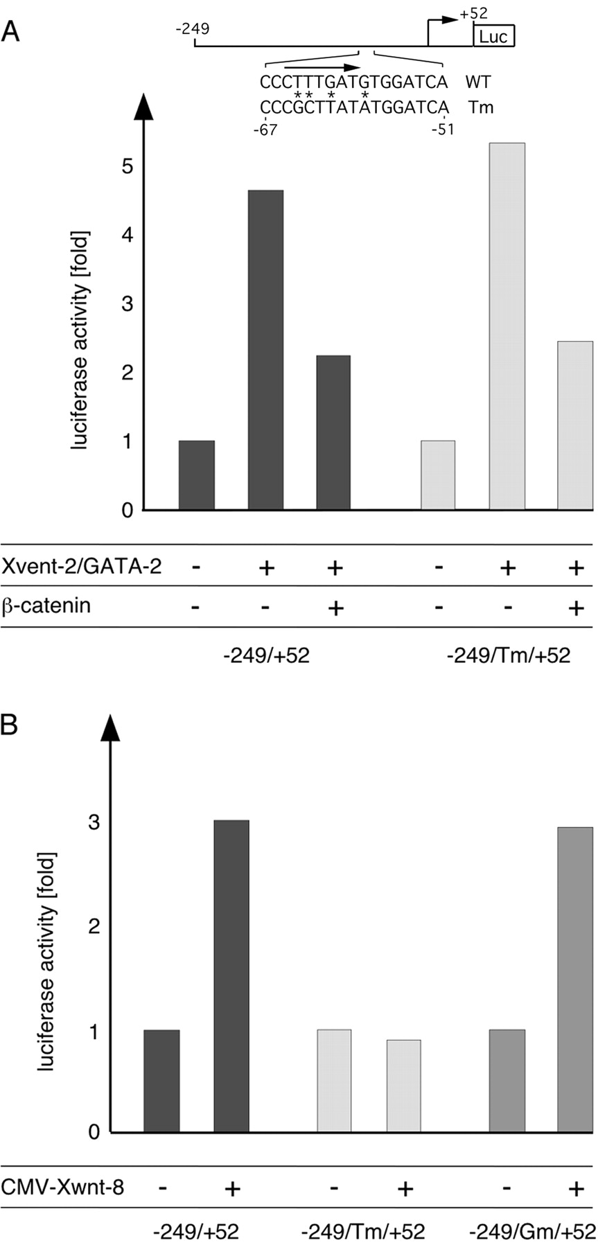 11. B, pGL3 constructs of the wild type (WT) or an Xvent-1B promoter mutated in the GATA-2 binding site (Gm) were coinjected with 50 pg of