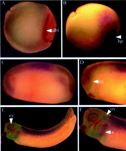 Fig. 3. Whole-mount in situ hybridization analysis of Hoxb4 (purple stain) and XRap1 (light blue stain) expression. (A) A gastrula stage embryo (stage 10.5) with the blastopore on the right. XRap1 staining is predominately in the dorsal ectoderm (which gives rise to the neural plate). No Hoxb4 expression is observed at this stage. (B) A late gastrula/early neurula stage embryo (stage 12, lateral view with the dorsal side down). Hoxb4 expression is apparent on the ventral/posterior side of the embryo and extends into the neural plate. XRap1 expression is confined to the neural plate. (C) Lateral view of a neurula (stage 20) embryo, anterior to left and dorsal side uppermost. XRap1 expression persists in the whole of the neural tube with the exception of the Hoxb4 expressing cells, roughly midway along the axis. (D) Lateral view of the anterior most (head) end of an early tailbud (stage 24) embryo. XRap1 staining is in the anterior neural tube including the eye, and abuts the area of Hoxb4 expression. (E) Lateral view of a tailbud (stage 28) embryo, anterior to left. (F) Enlargement of the anterior end of the embryo shown in (E). XRap1 and Hoxb4 expression domains abut closely in the hindbrain just posterior to the otic vesicle and in the headmesenchyme, where a stripe of Hoxb4 expression (*) marks the fourth pharyngeal arch. bp, blastopore; dbl, dorsal blastopore lip; ey, eye; ov, otic vesicle.