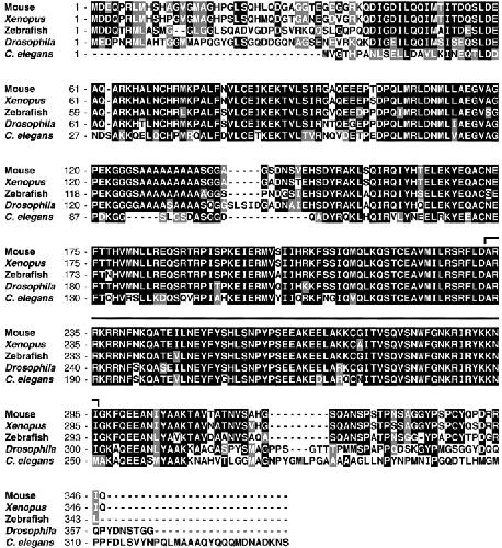 Figure 1 Xpbx1b encodes a TALE family homeodomain-containing protein. Amino acid comparison of the coding sequences of Xenopus Pbx1b, Mouse Pbx1b, Drosophila extradenticle, Zebrafish Pbx 4(Lazarus), and C. elegans Pbx (Ceh-20). Identical residues are shaded in black, conservative differences are shaded in gray, and white represents nonhomology. The bracketed area above the sequence denotes the homeodomain region.