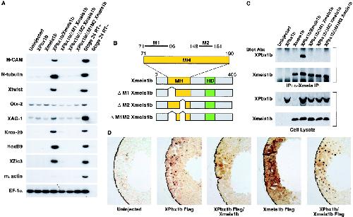 Figure 3 Interaction of XPbx1b and Xmeis1b induces posterior neural and neural crest markers in animal cap explants in the absence of mesoderm. (A) The animal pole region of two-cell stage embryos were injected with either XPbx1b RNA (1.0 ng per embryo), Xmeis1b RNA (0.5 ng per embryo), or both RNAs. Animal pole explants were excised at stage 9 and cultured until stage 26. RT-PCR gene analysis was performed for N-CAM (pan-neural), N-tubulin (pan-neuronal), Xtwist (neural crest), Otx-2 (forebrain), XAG-1 (cement gland), Krox-20 (hindbrain), HoxB9 (spinal cord), Xzic3 (proneural and early neural crest marker), muscle actin (dorsal mesoderm), and EF-1a (loading control). Stage-24 embryonic RNA with or without reverse transcriptase (RT+ or RTâ) also was used as a positive and negative reaction control. Note that coinjection of XPbx1b and Xmeis1b RNA induced the expression of posterior neural and neural crest cell markers. (B) Schematic representation of the Xmeis1b mutants. Wild-type Xmeis1b consists of a Meis-Homothorax domain (MH, yellow box) and homeodomain (HD, green box). MH domain possesses two subdomains: M1 box (amino acids 71â96) and M2 box (amino acids 148â161) that are important for Pbx binding. Deletions of one or more subdomains are indicated. (C) XPbx1b and Xmeis1b physically interact. The animal pole region of two-cell stage embryos were injected with either XPbx1b (2.5 ng per embryo) or Xmeis1b (2.5 ng per embryo) RNA alone or were coinjected with XPbx1b and Xmeis1b wild-type and mutant RNAs. Embryos were cultured until stage 9, and embryonic extracts were prepared and either directly immunoblotted (Lower) or immunoprecipitated with an anti-Xmeis1 antibody before immunoblotting (Upper). Anti-Meis1 antibody or anti-Pbx1b antibody was used to detect the indicated protein. Note: the Xpbx1b protein was coimmunoprecipitated with the wild-type Xmeis1b but not with any of the Xmeis1b mutants. (D) Nuclear localization of the Xmeis1b protein depends upon the XPbx1b protein in frog embryonic cells. The animal pole region of two-cell stage embryos was injected with either Flag tagged XPbx1b (2.5 ng per embryo) or Flag-tagged Xmeis1b RNA (2.5 ng per embryo) alone or in combination with Xmeis1b or XPbx1b RNA (2.5 ng per embryo). Injected embryos were fixed at stage 9, embedded, sectioned, and immunostained with anti-Flag antibody. Note that Xmeis1b protein was in the cytoplasm when expressed alone but was localized in the nuclei in the presence of XPbx1b. In contrast, XPbx1b was localized in the nuclei regardless of whether exogenous Xmeis1b was present.