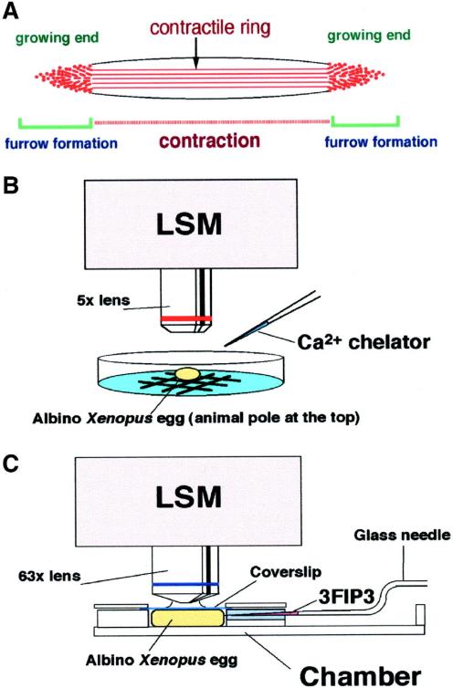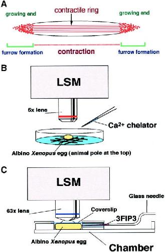 Fig. 1. Calcium imaging systems. (A) Schematic representation of the cleavage furrow and the F-actin structures. The two growing ends are the sites where the contractile ring structure is continuously formed. However, the middle region is where contraction occurs. It has been shown that rhodamine-WGA staining colocalizes with F-actin staining at the growing end of the cleavage furrow. SeeNoguchi and Mabuchi (2001) for detail. (B) Imaging of Ca waves was carried out using LSM at low magnification. Albino eggs were observed from the animal hemisphere to monitor the early cleavage furrow. Ca chelators were injected from the side during imaging. (C) Imaging of Ca puffs and Ca blips was carried out in a handmade chamber for scanning at high magnification using the LSM. In the chamber, the egg was compressed by a coverslip in order to flatten the cortex. The chamber has a slit at one side to introduce the glass needle for microinjection. |