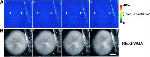 Fig. 2. Dual time-lapse imaging of [Ca2+]i and the newly emerging cleavage furrow. (A) Time-lapse images at an interval of 90 s depict increasing fluorescence intensity of CalG-dx (increasing free [Ca2+]i: (FCalGâ FCNF)/FCNF Ã 2.5) on a pseudocolor scale as indicated by the color bar. The positions of the growing ends in B are indicated with yellow arrowheads. Note that no obvious elevation of the free [Ca2+]i was detected at the growing end of the cleavage furrow. (B) Serial images of a newly emerging and elongating cleav-age furrow stained with rhodamine-WGA (the white line in the middle of the egg). Each image was simultaneously obtained with those shown in A. Scale bar, 0.2 mm. |