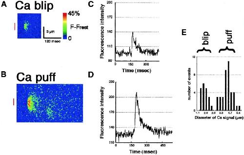 Fig. 3. Line-scan images of Ca blips and puffs that were induced by the injection of 3FIP3 detected in the animal hemisphere. (A and B) Pseudocolor representations of local increase of free [Ca2+]i at a single Ca blip (A) and puff (B) recorded by confocal line-scanning. The changes of fluorescence intensity every 3 ms on a line at a fixed position is depicted. The abscissa represents the time and ordinate represents scale (μm). The traces in C and D show the fluorescence intensities monitored across the area indicated by red bars in A and B, respectively. Note that the signal in A is well distinguished from the background noise. Diameters, durations, and total signal masses are significantly different between Ca blips and Ca puffs. (E) A histogram showing the size distribution of Ca signal events. The half-maximal diameters of 59 Ca signals obtained from 8 eggs were measured. There are two groups of signals observed with different half-maximal diameters. The averages of the half-maximal diameters are 1.8 ± 0.45 μm in the left group (Ca blips) and 4.3 ± 0.65 μm in the right group (Ca puffs). |