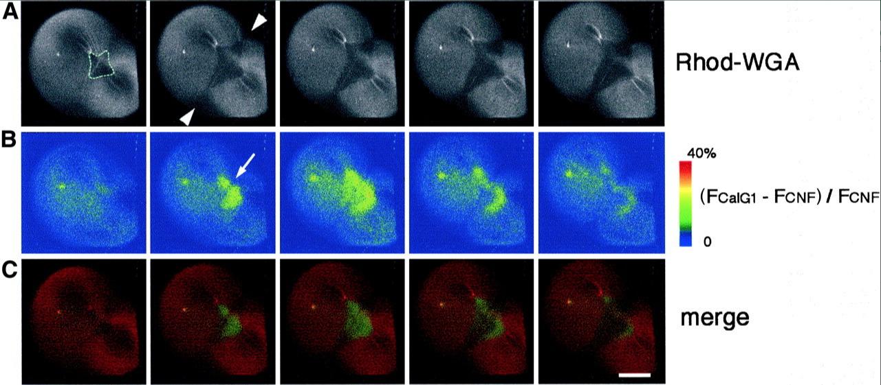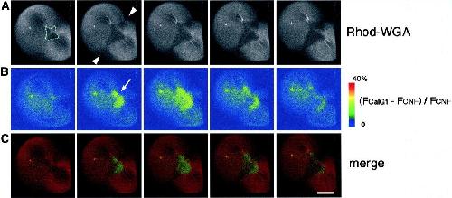 Fig. 5. Dual imaging of rhodamine-WGA staining and Ca wave 1. (A) A time-lapse recording of rhodamine-WGA staining of the egg surface during furrow deepening at 2-min intervals. The region where the membrane is newly inserted appears as a dark region (the area encircled by a dotted line). The arrowheads indicate the division plane. (B) Pseudocolored images of increased free [Ca2+]i; (FCalG â FCNF)/FCNF Ã 2.5, simultaneously obtained with the images in a, demonstrating that Ca wave 1 propagates in the furrow region. Duration of Ca wave 1 is significantly shorter than that of cytokinesis. It is excluded from the contractile ring area (arrow). (C) Merged images of (A, red) and (B, green). Wave 1 is restricted to the area of newly inserted membrane. Scale bar, 0.2 mm. |
