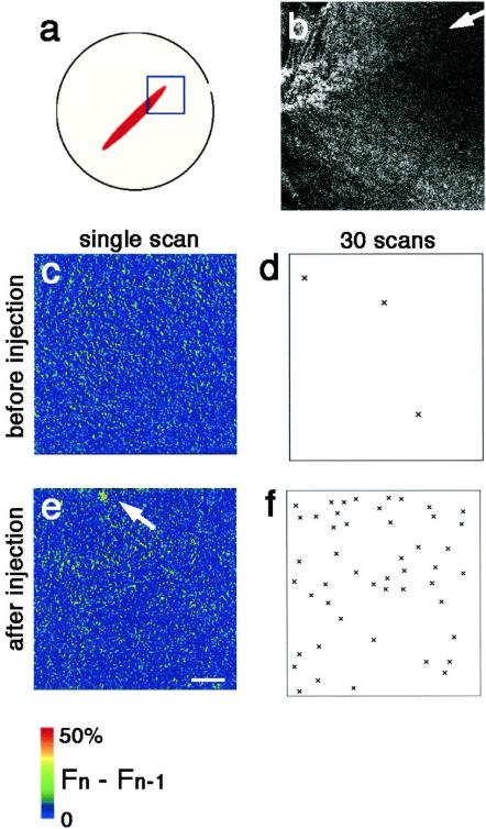 Fig. 4. Neither Ca puffs nor Ca blips appear at the growing end of the cleavage furrow. (a) An egg at an early stage of cytokinesis was labeled with rhodamine-WGA to mark the cleavage furrow, and [Ca2+]i was monitored using Fluo-4. The area indicated by the square in a was scanned for the Fluo-4 fluorescence. Thirty frames were obtained at the speed of 0.78 s/frame. This scan speed is equal to that of the line-scan in Figure 3. After this data collection, 3FIP3 was injected near the scan area. Again 30 frames of scan images were obtained at the same speed in the same area. (b) Rhodamine-WGA staining of the growing end of the cleavage furrow shown in a. The white arrow indicates the position of the growing end of the cleavage furrow. (c and e) Representative single confocal frame scan images, showing increased free [Ca2+]i: (Fn â Fnâ1) à 2 in a pseudocolor scale before (c) and after (e) 3FIP3 injection in the area shown in a. The arrow indicates a Ca blip detected after 3FIP3 injection. (d and f) Patterns of subcortical Ca release before (d) and after (f) 3FIP3 injection. The total Ca signals and their position identified in all 30 frame scans, in the same field shown in a, c, and e are marked (Ã). Ca signals are clearly distinguishable from noise based on their signal mass and diameters (>1.5 μm). Only three signals are detected around the growing end of the cleavage furrow before 3FIP3 injection, whereas 48 Ca microspikes including both Ca blips and Ca puffs were detected in the respective 30-frame scans after injection. Scale bar, 25 μm. |