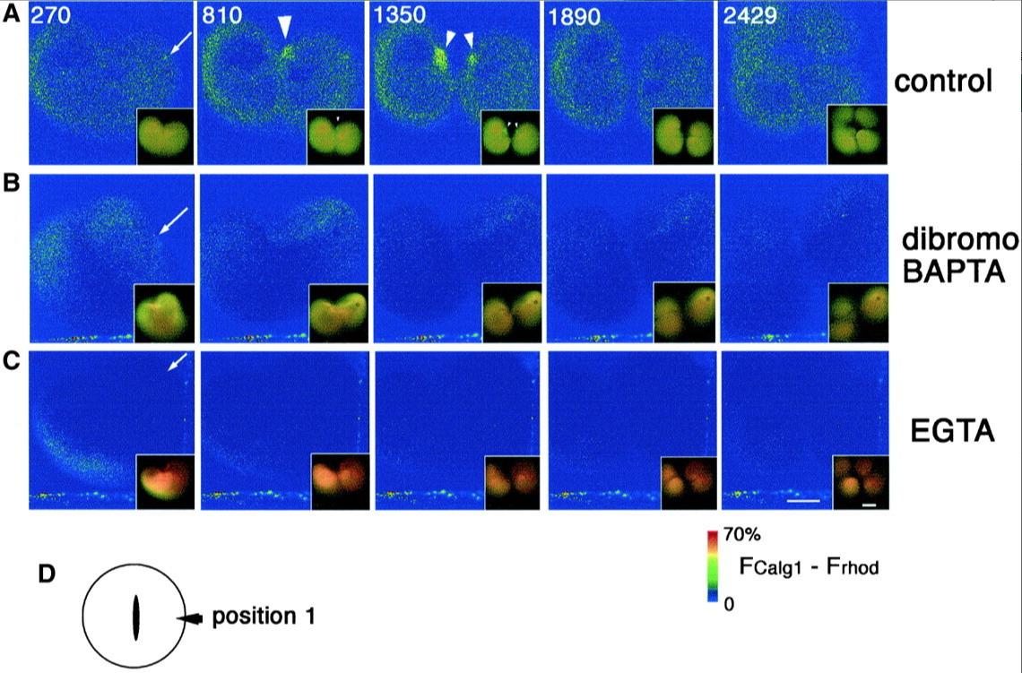 Fig. 8. dibromoBAPTA or EGTA effectively suppresses both Ca wave 1 and 2 without affecting cytokinesis. Pseudocolored time-lapse images showing the change of free [Ca2+]i after Ca chelator injections. Four nanoliters each of the injection buffer alone as control (A), 0.9 mM (final concentration in the cytosol) dibromoBAPTA (B), or 0.9 mM (final concentration) EGTA (C), were injected into dividing eggs during early furrowing at a polar region (D and arrows in AâC), and the effects on both cytokinesis and free [Ca2+]i;(FCalG â FRhod) Ã 1.4, were monitored. The merged raw data for CalG-dx and Rhod-dx are also presented in the right bottom of each pseudocolor image to show the appearance of the embryos. Yellow color represents the resting level of the [Ca2+]i. As the [Ca2+]i was lowered by Ca chelators, the color turned to reddish. The numbers in A indicate times (seconds) after injection. Images in B and C were obtained at the same time points. (A) In the control egg, Ca wave 1 and 2 were detected at 810 s and 1350 s, respectively (arrowheads). (B) Injection of dibromoBAPTA did not alter the free [Ca2+]i significantly as expected from itsKd for Ca ion. In the dibromoBAPTA-injected egg, both wave 1 and wave 2 were suppressed but the first cleavage was not affected or only slightly delayed. The second cleavage of the blastomere on the injection side was inhibited. Deformation occurred frequently around the site of the injection (inset of the picture of 270 s). (C) The injection of EGTA lowered the [Ca2+]i immediately and significantly. Both Ca wave 1 and wave 2 were suppressed. However, the first and second cleavages occurred normally. (D) Position of injection site. Position 1, position away from both ends of the cleavage furrow. Scale bars, 0.2 mm. |