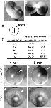 Fig. 6. Ca wave 2 propagates along the border of old and new membranes after completion of cytokinesis. (A) Representative merged image of rhodamine-WGA staining (red) and increasing free [Ca2+]i: (FCalG â FCNF) Ã 2 (green) during Ca wave 2 after completion of the first cleavage. Wave 2 emerged at the animal pole and traversed along the border of old and new membranes. Arrowheads in the image at 0 s indicate the starting point of wave 2, and those in the image at 124 s indicate the wave front. Note that the egg had already divided into two blastomeres before wave 2 first appeared. (B) Gray scale images of increased free [Ca2+]i; (FCalG â FRhod) during a typical wave 2. The yellow line in âtime 0â indicates the position of the division plane. Wave 2 does not propagate continuously, but often skips a distance of several hundred micrometers, reappearing along the border of the two membranes or flickering at some particular site several times. Arrowheads indicate initiation sites of wave 2. At site 1, Ca signal is flickering (the signal is seen during 0â95 s, disappears and then reappears after 152 s). There seemed to be no synchrony between the waves in the two blastomeres. Numbers indicate the recording time (seconds). Scale bars, 0.2 mm. |