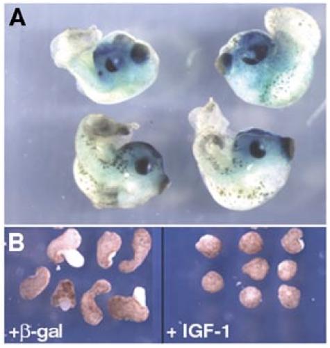 FIG. 3. Overexpression of IGF-1 inhibits convergent-extension movements. (A) Dorsal injections of IGF-1 mRNA (1–3 ng in one dorsal blastomere at the 4-cell stage) lead to dorsally curved embryos with truncated posterior tissue. (B) In the presence of activin, control ectodermal explants derived from embryos injected with -galactosidase RNA (1.5 ng/blastomere at the 2-cell stage) elongate (left panel), but explants derived from IGF-1-injected embryos (1.5 ng/blastomere) remain round (right panel).