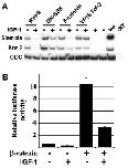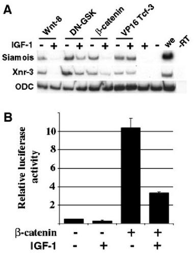 FIG. 6. IGF-1 inhibits Wnt signaling in ectodermal explants. (A) IGF-1 mRNA (1.5 ng per blastomere) inhibits induction of Siamois and Xnr-3 by Wnt-8 (10 pg per blastomere), DN-GSK (150 pg per blastomere), and -catenin (50 pg per blastomere) in ectodermal explants by stage 10.5, but fails to block activation of Wnt target genes by VP16 Tcf-3 (50 pg per blastomere). (B) IGF-1 mRNA (1.5 ng per blastomere) inhibits the transcriptional activity of the -catenin/Tcf complex. Embryos were injected at the two-cell stage along with the luciferase reporter plasmid (TOPFLASH) and RNAs as indicated (IGF-1 mRNA, 1.5 ng per blastomere; -catenin mRNA, 50 pg per blastomere). Embryos were collected at stage 10.5 in pools of five embryos and assayed for luciferase expression in triplicate.