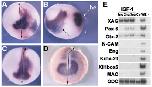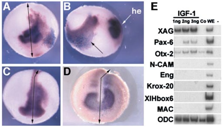 FIG. 4. IGF-1 overexpression induces anterior neural markers expression. Whole-mount in situ hybridization shows an expansion of expression of Otx-2 (A, front view; B, lateral view; he, head), NCAM (C), and Pax-6 (D) on the injected side (right side). (E) RT-PCR analysis of ectodermal explants injected with IGF-1 mRNA shows that IGF-1 induces anterior markers (Co, uninjected ectodermal explants; WE, whole embryo at tailbud stage; -, water control).