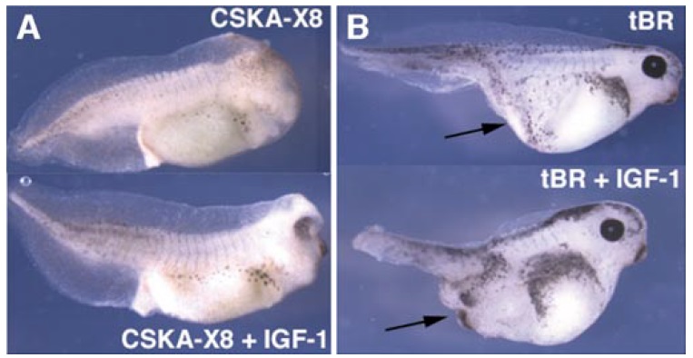 FIG. 7. IGF-1 inhibits Wnt-posteriorizing activity after MBT. (A) Injection of IGF-1 mRNAs (1.5 ng per dorsal blastomere, four-cell stage) rescues posteriorization induced by injection of CSKA-X8 plasmid (75 pg per blastomere). (B) Coinjection of IGF-1 mRNA (2 ng) with tBR mRNA (0.5 ng) into one ventral blastomere at the four-cell stage induces an ectopic head with a visible eye (arrow), unlike tBR mRNA alone which induces only a partial axis with no head structures (arrow).