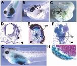 FIG. 1. Expression of IGF signaling components during Xenopus development. (A) RT-PCR analysis of IGF-1 and IGF-2 transcripts throughout development. (B) RT-PCR analysis of IGF-1 expression at early neurula stage (D, dorsal; V, ventral side of the embryo). (CâG) IGF-1R mRNAs detected by in situ hybridization (bl, blastopore; he, head; cgp, cement gland primordium; cg, cement gland). Expression is first detected at the end of the gastrulation (stage 12) in the presumptive dorsal side of the embryo (C) but excluded from the ventral part of the embryo (D). During neurulation, transcripts are present in the head region and in the anteriormesoderm, but are not detectable in the neural tube and the ventral part of the embryo (E, frontal view; F, lateral view). At tailbud stage, transcripts are present in the head and the anterior part of the neural tube (G).