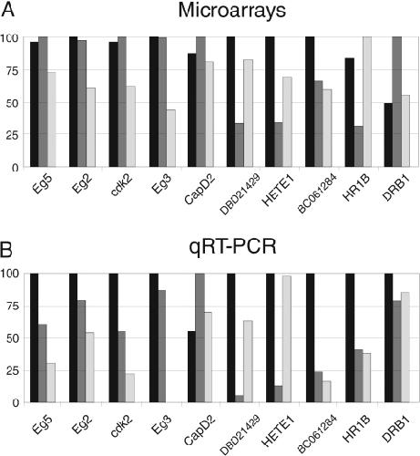 Figure 1. Comparison of microarray and qRT–PCR results. Relative amounts of poly(A)+ mRNA of the indicated gene products in stage VI oocytes (black bars), UFE (gray bars) and 64-cell embryos (open bars), as measured by (A) microarrays and (B) qRT–PCR. Relative levels for microarray data are given with the maximal normalized intensity as 100%, and for qRT–PCR, the maximal poly(A)+ mRNA amount is considered as 100%.