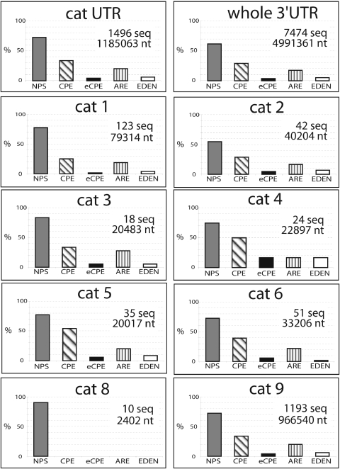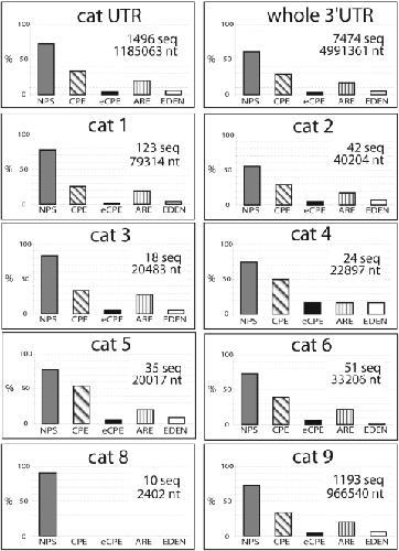 Figure 2. Sequence analysis of mRNAs classified according to their adenylation behaviors. Regulatory sequences were searched for in putative 3′-UTR of mRNAs in each category. For each category, the percentage of sequences containing the regulatory element is indicated. The number of sequences analyzed and the total length of the sequence in each category are indicated. The percentage of each regulatory sequence elements in the totality of the 3′-UTR sequences of categorized mRNAs (cat UTR) and of all the UTR's recovered from the genome annotation (whole 3′-UTR) is indicated.