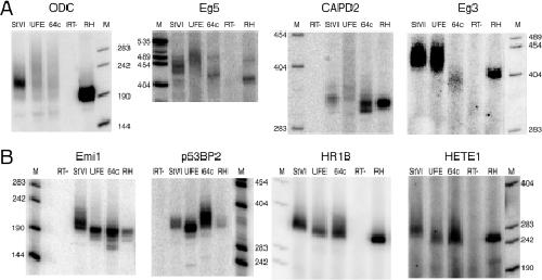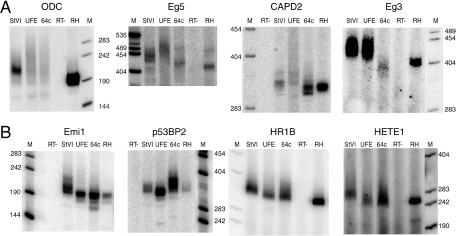 Figure 4. Adenylation behaviors of selected X.tropicalis endogenous mRNAs. Total RNAs from StVI oocytes, UFE and 64C embryos were analyzed by RL-PAT. The identity of the tested mRNAs is indicated above each panel. Oligo(dT)/RNase H digestion (RH) was performed on StVI oocyte total RNA. M, DNA size markers. In RT- control lanes, ligated RNAs were not reverse transcribed before PCR. (A) RL-PAT results for mRNAs with known adenylation behaviors in X.laevis. (B) RL-PAT results for mRNAs with unknown behaviors.