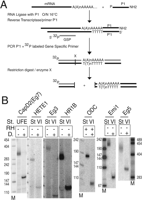 Figure 3. RL-PAT specificity. (A) Schematic of the RNA ligation mediated poly(A) test, as described by Rassa et al. (35). P1 denotes the primer ligated to the 3′-UTR of the RNA, the 3′ end of P1 is blocked by an amino group. cDNA synthesis is achieved from primer P′1 and PCR products are radiolabeled by the 32P phosphorylated gene-specific primer (GSP). X indicates a restriction site, radiolabeled fragments are in gray. (B) Specificity of RL-PAT was tested by restriction digest (D) of PCR products obtained from StVI oocyte or UFE RNA as indicated (St., stage). The identity of the tested mRNAs is indicated above each lane. When indicated, RNase H (RH) digestion in the presence of oligo(dT) was performed prior to the RL-PAT. M, radiolabeled DNA size markers as indicated (base pairs).