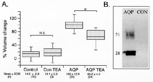Figure 1. Block by TEA of AQP1-mediated water permeability in monolayers of adenovirus-infected MDCK cells. (A) To account for differences in levels of AQP1 expression between different experimental preparations, data for Percent water flux were standardized to the mean water flux measured for AQP1-expressing monolayers without TEA on the same experimental day. Cells infected with empty adenovirus were untreated (Control) or treated with TEA (Con TEA). Cells infected with AQP1 adenovirus and expressing AQP1 were untreated (AQP) or treated with TEA (AQP TEA). Box plots show the distribution of data values; the gray box encloses 50% of the data points, the error bars show the full range, and the horizontal bar shows the modal value. Data for mean, standard error and n value are shown below each column. Significant differences were analyzed by T-test and are reported as p < 0.001 (*), and not significant (N.S.; p < 0.50) (B). Whole cells lysates were prepared from MDCK cells on filters and 10 μg of protein was loaded onto each lane. Shown is the expression of AQP1 protein in MDCK cells infected with empty (CON) or AQP1 adenovirus. No AQP1 protein was seen in CON lanes even after extended exposures to film (i.e., 30 minutes).