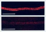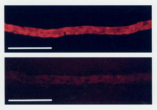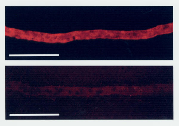 Figure 2. Immunocytochemical analysis confirms the expression of AQP1 channels in pure descending but not ascending thin limb preparations. Examples are shown for isolated preparations of rat inner medullary descending thin limb(upper panel) and inner medullary ascending thin limb (lower panel) labeled with a rabbit antibody to the AQP1 carboxy tail domain, and visualized with Cy5-labeled antirabbit antibody immunoglobulin-G. The scale bar is 100 μm.