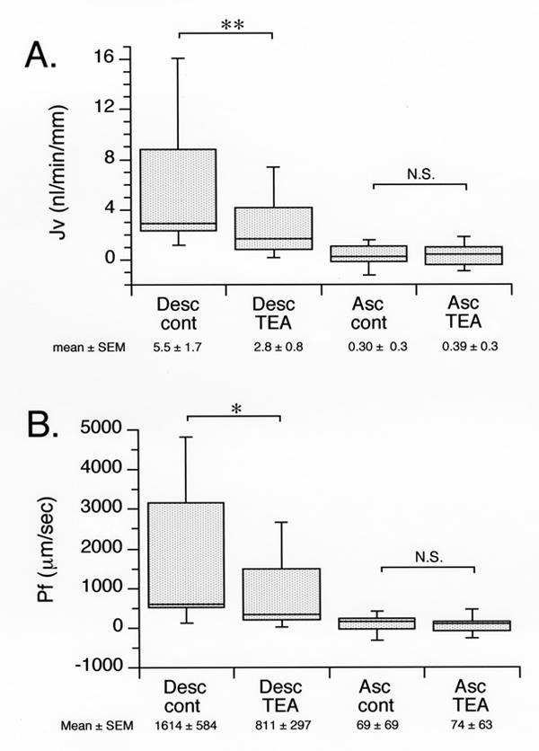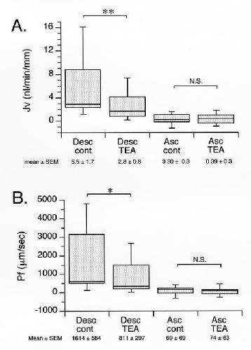 Figure 3. Analysis of water flux in isolated perfused renal ascending and descending thin limbs of Henle's loop under osmotic gradient conditions.A. Compilation of Jv values obtained for descending thin limbs that were untreated (Desc cont) or exposed to 10 mM TEA (Desc TEA), and for ascending thin limbs that were untreated (Asc cont) or exposed to TEA (Asc TEA). B. Compilation of calculated osmotic water permeabilities (Pf) for the same tubules as analyzed in (A). Box plots show the distribution of data values; the gray box encloses 50% of the data points, the error bars show the full range, and the horizontal bar shows the modal value. Data for group means, standard errors and n values are shown below each column. However, since each tubule served as its own control, differences were analyzed by paired T-test and are reported as p < 0.02 (**), p < 0.05 (*), and not significant (N.S.).