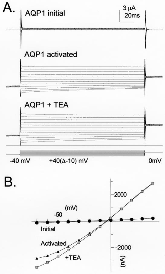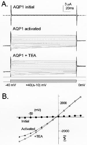 Figure 4. Tetraethylammonium does not block the ionic conductance in cGMP-activated AQP1 channels expressed in Xenopus oocytes.A. Recordings of current responses to voltage steps analyzed by two-electrode voltage clamp in an AQP1-expressing oocyte before stimulation (initial), after cGMP-dependent activation in 100 mM Na+ saline (activated) and after perfusion with saline containing 10 mM TEA and 90 mM Na+ (+TEA). No block of the ionic current was observed. B. Plot of the current-voltage relationship for data illustrated in (A). Conductance values calculated from linear fits of the data from -50 to +30 mV were 3.0 μS initial, 57.8 μS after activation in Na+ saline, and 57.3 μS with 10 mM TEA.