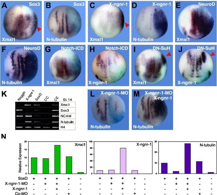 Fig. 2. (AâJ) Regulation and requirement of Xmxi1 during primary neurogenesis. Whole-mount in situ hybridization of stage 14 embryos injected with Sox3 (50 pg), X-ngnr-1 (50 pg), NeuroD (500 pg), Notch-ICD (50 pg), or DN-Su(H) (300 pg), as indicated in the upper righthand corner. The antisense probes used are indicated in the lower lefthand corner. The injected side (β-gal, light blue) is on the right, and embryos are shown as a dorsal view, anterior down. Red arrowhead marks ectopic expression (A, C) or the increased density of the lateral stripe (I, J). (K) Xmxi1 is activated by X-ngnr-1 and SoxD, but not by the neural inducer noggin. RT-PCR analysis of animal caps isolated from embryos injected with noggin (50 pg), X-ngnr-1 (25 pg), and SoxD (200 pg), as indicated. Histone H4 was used as a loading control. CC, control caps; CE, control embryos. (L, M) N-tubulin expression of stage 14 embryos injected with X-ngnr-1-MO (15 ng) and X-ngnr-1 (25 pg), as indicated in the upper righthand corner. (N) SoxD activation of Xmxi1 does not require X-ngnr-1. Animal caps were isolated from embryos injected with SoxD (200 pg), X-ngnr-1-MO (15 ng), X-ngnr-1 (25 pg), and control-MO (Co-MO) (15 ng), as indicated, cultured until sibiling embryos reached stage 14 and subject to real-time RT-PCR analysis. Expression levels were normalized to ornithine decarboxylase (ODC) and compared to the induction capacity of SoxD, which was set to 10. Note that X-ngnr-1 RT primers detect both endogenous and injected X-ngnr-1 RNA.