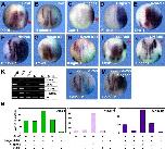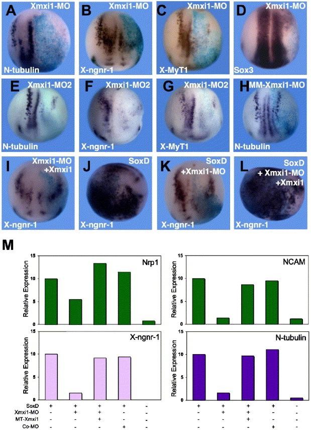 Fig. 3. Xmxi1 is required for primary neurogenesis. (AâL) Whole-mount in situ hybridization of stage 14 embryos injected with Xmxi1-MO (12.5 ng), Xmxi1-MO2 (15 ng), mismatch morpholino MM-Xmxi1-MO (12.5 ng), MT-Xmxi1 (500 pg), or SoxD (200 pg), as indicated in the upper righthand corner. The antisense probes used are indicated in the lower lefthand corner. The injected side (β-gal, light blue) is on the right, and embryos are shown as a dorsal view, anterior down with the exception of J and L, which are lateral. (M) Xmxi1 is required for SoxD-induced neuronal differentiation. Animal caps were isolated from embryos injected with SoxD (200 pg), Xmxi1-MO (12.5 ng), Co-MO (12.5 ng), and MT-Xmxi1 (500 pg), as indicated and analyzed by real-time RT-PCR. Expression levels were normalized to ODC and were compared to the induction capacity of SoxD-injected animal caps, which was set to 10.