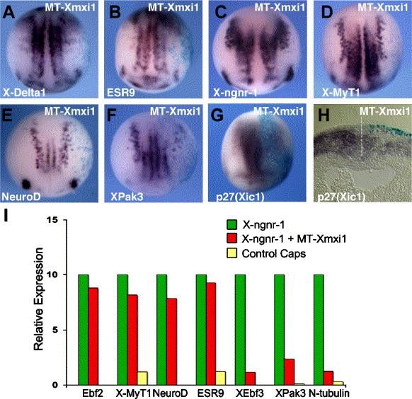 Fig. 6. Xmxi1 inhibits genes required for cell cycle withdrawal but does not influence neurogenic and early proneural genes. (AâG) Whole-mount in situ hybridization of stage 14 embryos injected with 500 pg of MT-Xmxi1. Antisense probes used are indicated in the lower lefthand corner. The injected side is always on the right, and all embryos are shown as dorsal views, anterior down. (H) Transversal section of G. (I) Xmxi1 blocks induction of late, but not early X-ngnr-1-induced target genes in animal caps. Real-time RT-PCR analysis of animal cap explants isolated from embryos injected with X-ngnr-1 (25 pg) alone or together with MT-Xmxi1 (500 pg). Expression levels were normalized to ODC and compared to the induction capacity of X-ngnr-1 injected animal caps, which were set to 10.