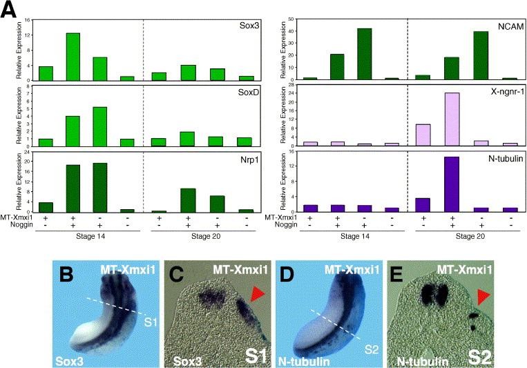 Fig. 7. (A) Xmxi1 induces neuronal differentiation in neuralized late, but not early animal caps. Animal caps were harvested from embryos injected with noggin (50 pg) and MT-Xmxi1 (500 pg), as indicated. At the equivalent of stage 14 or 20, the caps were harvested and analyzed by real-time RT-PCR. Expression levels were normalized to ODC and compared to control caps, which were set to 1. (BâE) The inhibition of neuronal differentiation by Xmxi1 is only transient. At tailbud stages, MT-Xmxi1 (750 pg) ectopic Sox3 is still present (B) and ectopic N-tubulin expression is also detected (D). (C, E) Transversal sections of B and D, respectively. Red arrowhead marks ectopic expression.