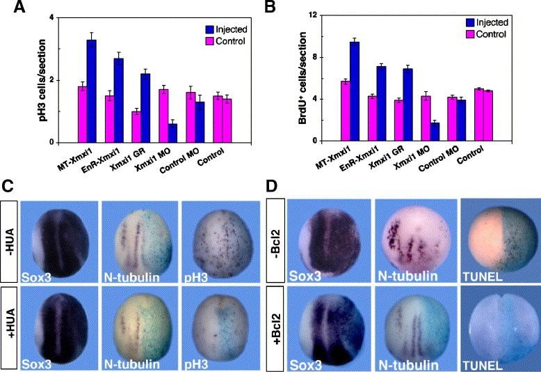 Fig. 8. Xmxi1 induces proliferation in the open neural plate of Xenopus embryos. MT-Xmxi1 (500 pg), EnR-Xmxi1 (500 pg), and Xmxi1-GR (500 pg, induced at stage 10.5 with dexamethasone), Xmxi1-MO (12.5 ng), or the control-MO (Co-Mo) (12.5 ng) was injected in Xenopus embryos. Proliferation on the injected side compared with the noninjected side was measured by counting (A) pH3 or (B) BrdU-positive cells of 15 consecutive sections of five embryos in the open neural plate region. Shown is the average number of positive cells per section. Error bars indicate the standard error of the mean. (C) Forced cell cycle arrest does not alter the phenotype of Xmxi1-injected embryos. In Xmxi1-GR-injected embryos, proliferation was blocked by HUA treatment at stage 10 and induced at stage 10.5 with dexamethasone. (D) Inhibition of MT-XMxi1-induced apoptosis does not rescue loss of N-tubulin. Overexpression of MT-Xmxi1 (500 pg) led to an increase in apoptosis as seen by TUNEL staining (upper panel, right). Coinjection of human Bcl2 mRNA (500 pg) blocked apoptosis (lower panel, right) but did not influence the effects of MT-Xmxi1 on Sox3 and N-tubulin.