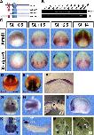 Fig. 1. (A) Comparison of the predicted amino acid sequence of Xmxi1 with the mouse Mxi1 isoforms. GenBank accession number Xmxi1: DQ137875. (B) RT-PCR analysis of Xmxi1 at different stages of development. Histone H4 was used as a loading control. (C) Whole-mount in situ hybridization expression analysis of Xmxi1 in comparison with X-ngnr-1. (DâF) Double labeling of Xmxi1 and Sox3 expression. Sox3, red; Xmxi1, dark blue. (D) Stage 14, anterior view. (E) Stage 14, dorsal view. White arrowhead marks the lateral stripe of Xmxi1. (F) Transversal section of E. (GâN) Spatial expression of Xmxi1 during later stages of Xenopus development. (G) Stage 13, dorsal, anterior up. (H) Stage 16, dorsal view, anteriorleft. (I) S1 transversal section. (J) Stage 22, lateral. (K) Stage 27, anterior (L) Stage 37, lateral. (M) S2 transversal section. (N) S3 transversal section, dark brown staining at the roof of the spinal chord is pigmentation not Xmxi1 staining. el, epithelial layer; hb, hindbrain; i, intermediate; iz, intermediate zone; l, lateral; le, lens; m, medial; mb, midbrain; n, notochord; op, olfactory placode, r, retina; sl, sensory layer; st, stage; tg, trigeminal placodes; vz, ventricular zone.