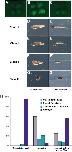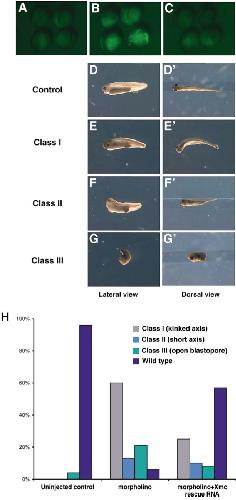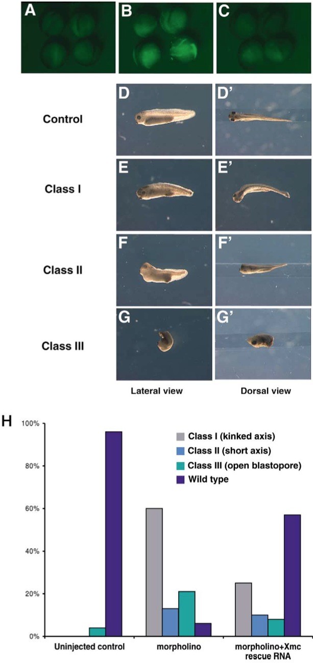 Fig. 6. Xmc loss-of-function results in gastrulation defects. Fluorescent images of control (A), Xmc.GFP-injected (B) and Xmc.GFP 1 Xmc morpholino- injected (C) neurula embryos. Embryos were injected with 800 pg Xmc.GFP mRNA with or without 8 ng morpholino in two animal blastomeres at the two-cell stage. Co-injection efficiently abolishes Xmc.GFP translation. Lateral (D) and dorsal (D00) views of stage 25 control embryos (D, D0) or embryos injected with ,10 ng of Xmc morpholino in two marginal blastomeres at the four-cell stage (E, E0, G0). Injection of Xmc morpholinos results in three classes of phenotypic alterations. Class I embryos (E, E0) display a marked kink in the primary axis, class II embryos (F, F0) have a shortened axis and class III embryos (G, G0) display severe gastrulation defects. (H) Quantitation of the phenotypic alterations. Histogram showing the frequencies of the phenotypes and the reduction after co-injection of Xmc morpholino with the Xmc.rescue construct.