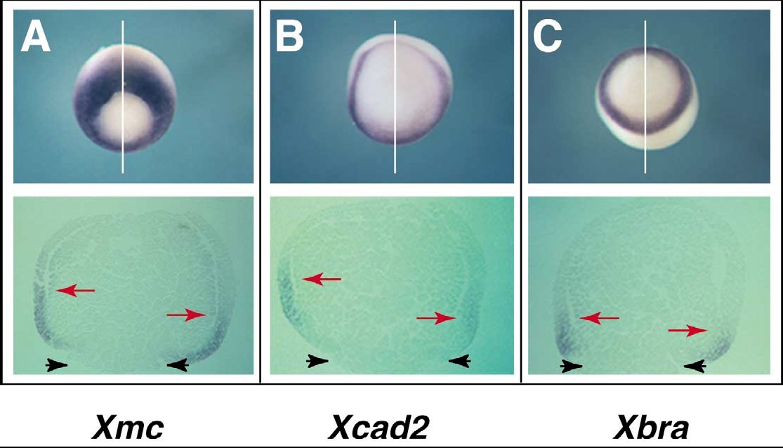 Fig. 3. Comparative expression of Xmc, Xcad2 and Xbra. Spatial expression of Xmc (A), Xcad2 (B) and Xbra (C) in whole mount-stained mid-gastrula embryos