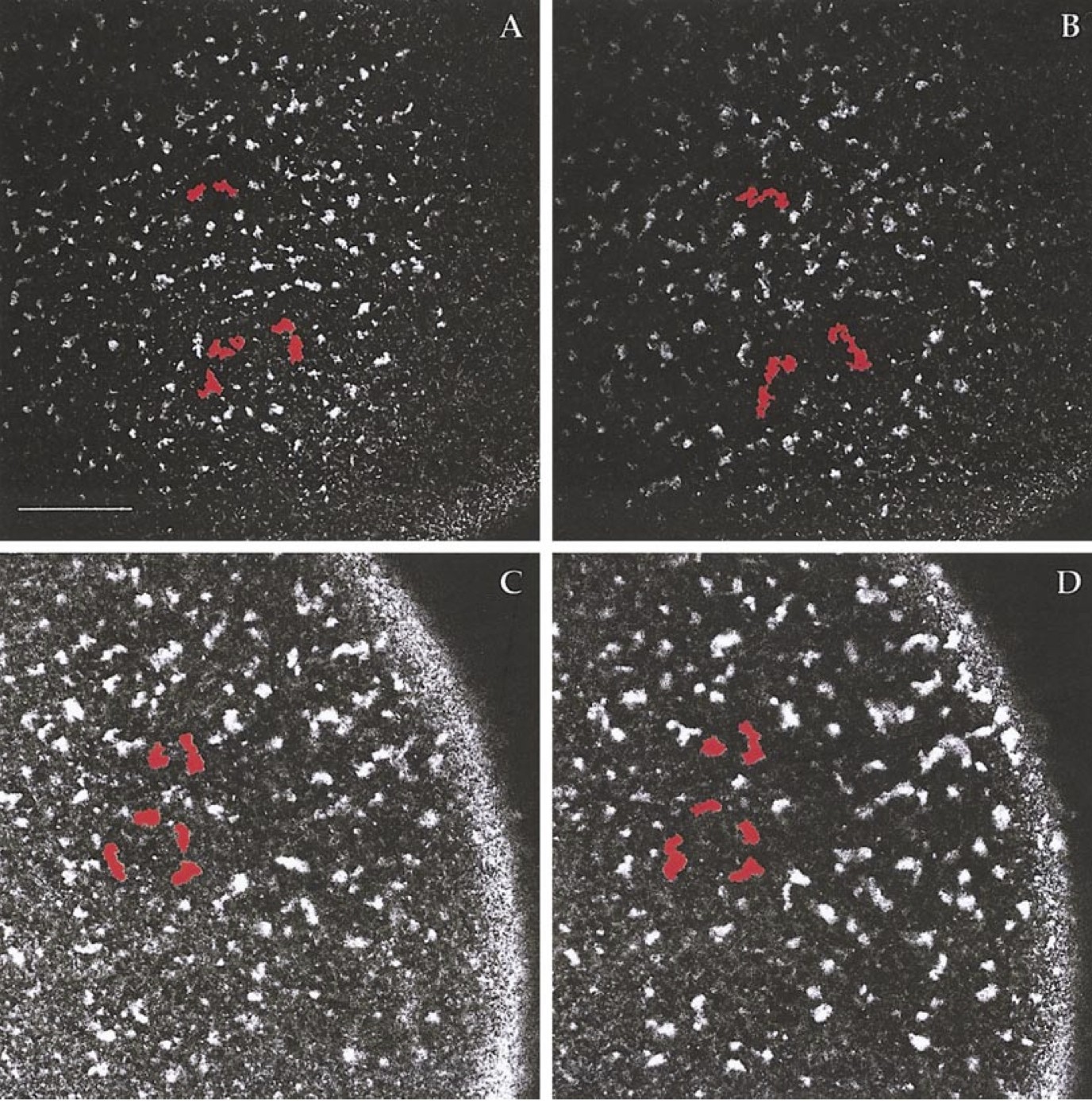 FIG. 4. Phase three (surface contraction waves) in control (A, B) and Xklp1-depleted (C, D) activated oocytes. In the control, frames are 15 min apart and are immediately before and after the passage of a single wave, which occurred 1.5 h after oocyte activation. The highlighted islands of germ plasm are pushed together by the wave, as are the groups surrounding them (not highlighted), and the total area of egg cortex occupied by germ plasm islands is reduced. In the Xklp1-depleted, the frames are 50 min apart, starting 1 h after oocyte activation. During this period, at least two waves normally occur in control eggs. The total area occupied by germ plasm islands remains the same. Scale bar, 74 um