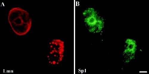 Figure 5. Disruption of lamin organization does not alter the distribution of Sp1. BHK 21 cells were microinjected with ΔNLA. Cells were stained with rabbit anti–human LA (A) and a monoclonal anti–human Sp1 (B). The cell on the left in each panel was not injected with ΔNLA and displays normal lamin and Sp1 staining. The cell on the right was injected with ΔNLA, and although lamin organization is disrupted, it also displays a normal distribution of Sp1. Bar, 5 μm.