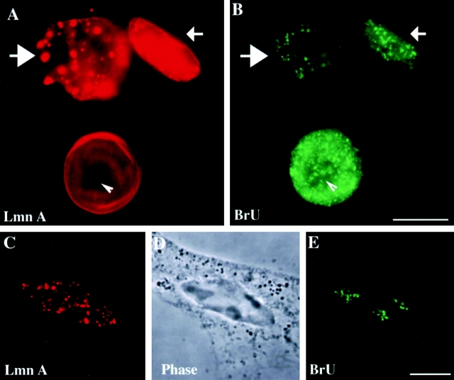 Figure 2. Disruption of lamin organization results in reduced incorporation of BrUTP. After microinjection of ΔNLA (arrows in A and B), cells were assayed for transcriptional activity by in situ incorporation of BrUTP. Cells were fixed and stained by immunofluorescence using antibodies directed against LA and BrU. At the bottom is an uninjected cell (A and B). The nucleolus of the uninjected cell is marked with an arrowhead. Lamin (C) and BrU (E) staining of another cell after microinjection of ΔNLA reveals that BrU incorporation is confined to nucleolar regions (D). Bars, 10 μm.