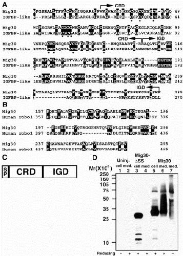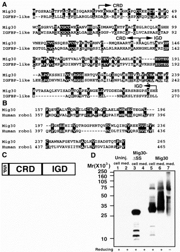 Fig. 2. Mig30 belongs to the IGFBP family. (A) Amino acid sequence alignment of Mig30 and mouse IGFBP-like protein. There is 32% similarity. Boxes show identical residues. Asterisks show conserved cysteine residues. (B) IGD possesses similarity to the IGD of the axon guidance receptor, human roundabout 1. (C) A schematic drawing of the structure of Mig30 protein. SP, signal peptide. (D) Mig30 protein is secreted. Mig30 mRNA was injected into oocytes, and the medium or cell extract was analyzed by Western blot using anti-Mig30 antibody. Mig30 protein was detected in the cell extract (lane 5) and in the medium (lane 6). Mig30-δSS was detected in the cell extract (lane 3), not in the medium (lane 4). Secreted Mig30 protein under non-reducing conditions is shown in lane 7. No signals were detected in the cell extract (lane 1) or in the medium (lane 2) of uninjected oocytes.