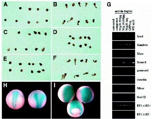 Fig. 8. Overexpression of Mig30 can inhibit convergent extension movements. (AâG) Mig30 mRNA was injected into all blastomeres in the animal pole region at the four-cell stage. The animal caps were cut at late blastula stage, exposed to activin (5 ng/ml) for 3 h. Elongation of the animal caps was observed 15â17 h after dissection. (A) Uninjected animal caps were left untreated. (B) Those treated with activin showed elongation. (CâF) Animal caps injected with 250 pg Mig30 mRNA (C), 500 pg Mig30 mRNA (D), 1 ng Mig30 mRNA (E) or 1 ng GFP mRNA (F) were treated with activin. The caps injected with Mig30 mRNA showed no elongation, whereas those injected with GFP mRNA elongated. (G) RT-PCR analysis of expression of mesodermal or endodermal markers in animal caps injected with Mig30 mRNA. Markers were analyzed at stage 10. (H,I) Cell lineage analysis. (H) Embryos were injected with 200 pg of β-gal mRNA into two dorsal blastomeres at the four-cell stage. The embryos were fixed at early neurula stage (stage 16) and β-gal activity was visualized. The β-gal-positive cells are concentrated on the dorsal midline. (I) Embryos coinjected with 200 pg of β-gal and 500 pg of Mig30 mRNA. β-gal-positive cells spread mediolaterally and showed little elongation along the anteroposterior axis. Bottom is an embryo in which the blastopore failed to close.