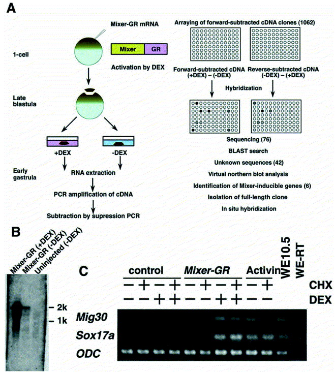 Fig. 1. Isolation of genes activated by Mixer-GR. (A) Screening procedure for genes activated by Mixer-GR in the presence of DEX. The details are described in Section 4. (B) Screening of Mixer-GR-inducible genes by virtual Northern blot analysis. cDNA, 0.5 μg, was loaded in each lane. (C) Mig30 expression by Mixer does not require protein synthesis. Mixer-GR mRNA, 50 pg, was injected into the animal pole region at the one-cell stage. Ectodermal explants were prepared at the late blastula stage. To inhibit protein synthesis, CHX was added to the medium 30 min before addition of activin (100 ng/ml) or DEX, and the explants were then cultured for 2.5 h. Expression of Mig30 and Sox17alpha was analyzed by RT-PCR. ODC serves as a loading control. WE10.5, sibling whole embryo; WE-RT, control reaction without reverse transcription.