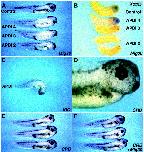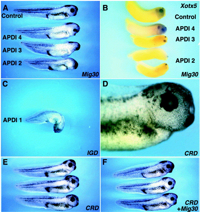 Fig. 5. Overexpression of Mig30 inhibits head development. (A) Embryos (stage 40) injected with 500 pg Mig30 mRNA into two dorsal blastomeres at the four-cell stage. Anterior structures are affected. (B) Expression pattern of Xotx5 in embryos (stage 31) injected with 500 pg Mig30 mRNA into all blastomeres at the four-cell stage. The embryo at the top was not injected. (C) An embryo injected with 250 pg IGD mRNA into two dorsal blastomeres at the four-cell stage, showing the APDI 1 phenotype. (D) Enlarged view of the bottom embryo in (E), showing abnormal retina formation. (E) Embryos were injected with 250 pg CRD mRNA into two dorsal blastomeres at the four-cell stage. The head is slightly enlarged compared with the control embryo. The embryo at the top was not injected. (F) Coinjection of Mig30 mRNA abolished the effect of CRD mRNA.