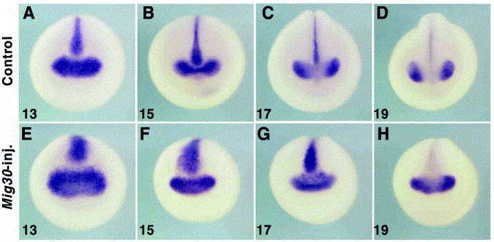 Fig. 6. Positional relationship between midline structures and eye field in Mig30-injected embryos. After injecting 500 pg Mig30 mRNA into two dorsal blastomeres at the four-cell stage, the embryos were analyzed by in situ hybridization for expression of shh and Rx1. shh and Rx1 demarcate the midline structures and eye field, respectively. (AâD) Control embryos. (EâH) Mig30-injected embryos. (A,E) Stage 13. (B,F) Stage 15. (C,G) Stage 17. (D,H) Stage 19.