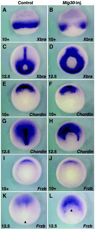 Fig. 7. Effects of overexpression of Mig30 on gene expression during gastrulation. Mig30 mRNA, 500Â pg, was injected into two dorsal blastomeres at the four-cell stage. Gene expression was analyzed by in situ hybridization. Left panels show control embryos. Right panels show Mig30-injected embryos. The stage is indicated at the bottom right of each panel. (AâD) Xbra expression. (EâH) chordin expression. (IâL) Frzb expression. The arrowhead indicates the position of the dorsal blastopore lip.