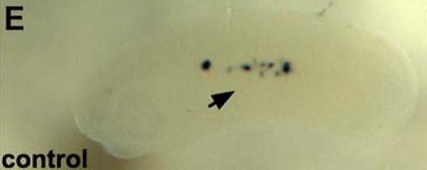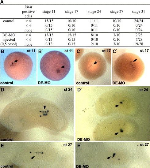 Fig. 6. Xpat expression in DE-MO injected embryos. (A) DE-MO injected embryos were analyzed for Xpat expression at the indicated stages. Data are shown as the number of embryos with the indicated expression out of the total number tested. (B, Bâ²) Control and DE-MO injected stage 11 embryos analyzed for Xpat expression showing normal Xpat expression located in the posterior endoderm. (C, Câ²) Control and DE-MO injected stage 17 embryos showing Xpat stained PGC in the endoderm. (D) Control embryo (stage 24) showing normal PGC distribution and (Dâ²) DE-MO injected embryos with tightly clustered PGCs. (E) Control stage 27 embryo with spaced distribution of Xpat-labeled PGCs and (Eâ²) in the DE-MO injected embryo PGCs appear slightly clustered. |