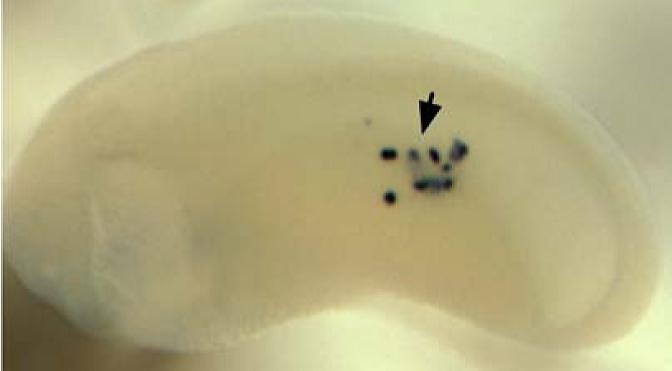 pgat (primordial germ cell-associated transcript protein) gene expression in a Xenopus laevis embryo, assayed by in situ hybridization, NF stage 24, lateral view, anterior left, dorsal up.