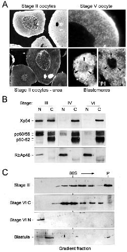 Xp54 helicase is redistributed between the nucleus and the cytoplasm and between large and small complexes during the course of early development. (A) Sections through the ovary (with or without prewash in 4 M urea) and the blastula, both immunostained with anti-p54. Nuclear particles and fibres are obvious in stage I/II oocytes and in blastomere on left (arrowheads). The blastomere on the right is stained with preimmune serum (PI) and shows no nuclear reaction (arrowheads), only autofluorescent yolk. Arrows on oocytes indicate the Balbiani body. (B) The level of Xp54 in the nucleus relates to the level of transcriptional activity. An immunoblot of isolated nuclei (N) and cytoplasms (C) from mid- to late-oogenesis with anti-p54, anti-pp60/56, anti-p50-52 and anti-RbAp48. (C) Extracts (SN10) from stage III oocytes, stage VI cytoplasms, stage VI nuclei and blastula, separated on glycerol gradients and immunoblotted with anti-p54 are shown.