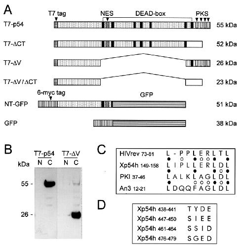 Recombinant forms of Xp54 and identification of potential NES and phosphorylation sites. (A) A diagram of recombinant proteins expressed in this study. The black boxes represent the conserved motifs seen in all DEAD-box helicases. Locations of a potential NES (cross-hatched) and four potential CK2 phosphorylation sites (PKS, white boxes) are indicated. Various fragments of Xp54 (grey areas) were expressed either with a T7 epitope-tag or as GFP fusions containing a 6-myc tag. The white areas to the right in T7-δCT and T7-δV/δCT represent replacement of the C-terminus of Xp54 with an unrelated sequence encoded by the plasmid. (B) An immunoblot of T7-p54 and T7-δV, overexpressed in stage VI oocytes, showing cytoplasmic (C) but no nuclear (N) reaction. (C) Comparison of the leucine-rich sequence of Xp54 with the NES of HIV Rev ( Fornerod et al., 1997), PKI ( Hauer et al., 1999) and An3 ( Askjaer et al., 2000). Positions of critical leucines (black circles) and other similarities (open circles) are indicated. The numbers refer to the residue positions starting from the initiating methionine. (D) The four potential CK2 phosphorylation sites (S/TxxD/E, where x is any non-basic residue) are located near the C-terminus of Xp54.