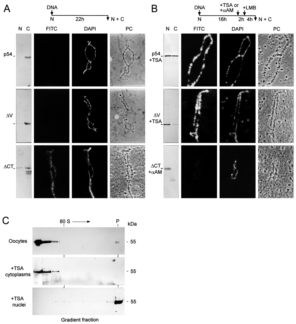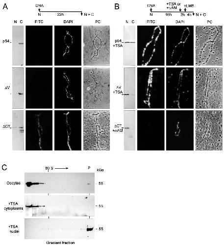 Import of recombinant Xp54 into the oocytenucleus and binding to nascent RNP is dependent on the transcriptional state of the chromatin. (A) The nucleocytoplasmic distribution of T7-p54, T7-δV and T7-δCT expressed in stage VI oocytes compared with binding of the recombinant proteins to the RNP matrix of lampbrush chromosomes is shown. The chromosome spreads were immunostained with anti-T7 IgG and FITC-conjugated anti-mouse IgG, post-stained with DAPI. Phase contrast (PC) microscopy images are also shown. (B) As described in (A) but with treatment of the oocytes with 2 ng/ml trichostatin A (TSA) or 0.5 μg/ml α-amanitin (α-AM) for two hours before addition of LMB. (C) Sedimentation of T7-p54 in complexes isolated from 50 stage VI oocytes and from nuclei and cytoplasms of 50 stage VI oocytes treated with TSA.