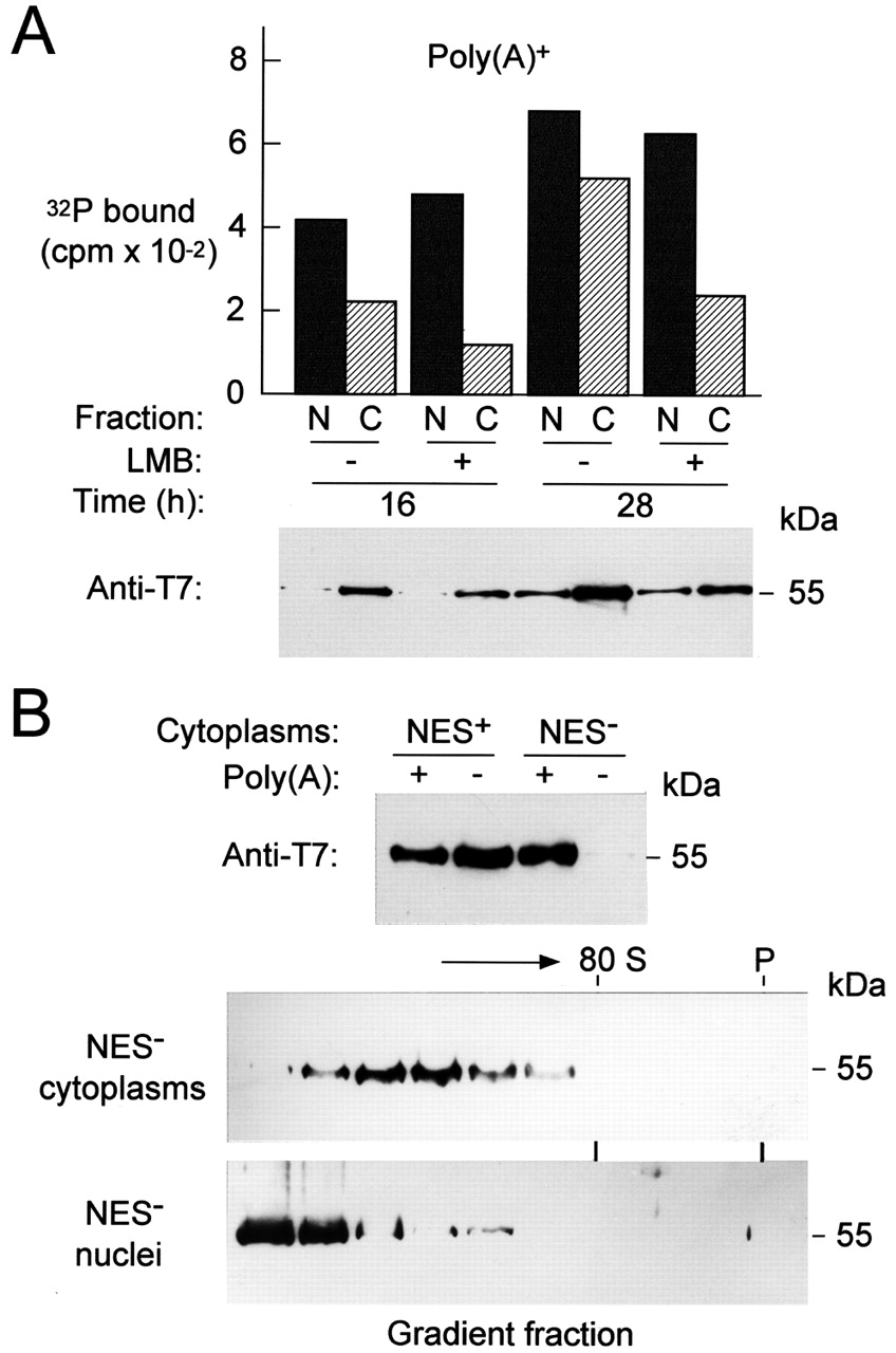 Treatment of oocytes with LMB or mutation of the leucine-rich NES of Xp54 has little effect on nuclear export of mRNP particles. (A) Stage III/IV oocytes expressing T7-p54 were injected with 0.1 μCi of 32P-CTP, and poly(A)+ RNP was extracted to assay radioactivity incorporated (columns) and T7-p54 present (immunoblot) in nuclei and cytoplasms after 16 and 28 hours. (B) Immunoprecipitation, with anti-T7 IgG, of poly(A)+ and poly(A)â RNP extracted from cytoplasms of stage III/IV oocytes expressing T7-p54 and mutant T7-p54NESâ for 60 hours. In addition, poly(A)+ tails from cytoplasms of 50 oocytes expressing T7-p54NESâ were run on glycerol gradients, and sedimentation fractions were analysed by immunoblotting for the T7-tag. The sedimentation of T7-p54NESâ from 50 nuclei is also shown.