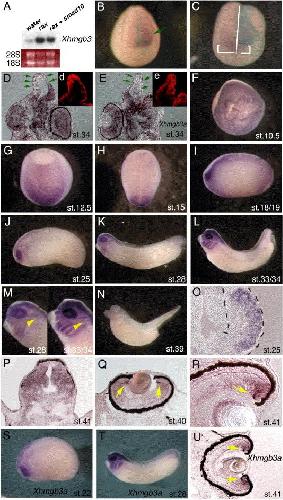 Fig. 1. Expression of Xhmgb3 mRNA and regulation of Xhmgb3 by rax. (AâE) Regulation of Xhmgb3 mRNA (AâD) or Xhmgb3a mRNA (E) by rax. Induction of Xhmgb3 (A and B) by rax overexpression. Reduction of Xhmgb3 (C and D) or Xhmgb3a (E) by rax MO injection. Northern blot analysis of total RNA isolated from animal caps injected with water, rax or rax + smad10 RNAs. The cDNA fragment encoding for entire protein of Xhmgb3 was used as a labeled probe (A). The lower panel shows Ethidium Bromide (EtBr) staining of ribosomal RNA (A). In situ hybridization using a probe of Xhmgb3 for embryos injected with rax and β-gal RNAs (stages 18/19) (B) or rax MO (1 pmol) and β-gal RNA (stages 17/18) (C) into one dorsal blastomere at 4- or 8-cell stage on the animal side. Anterior view with dorsal to the top (B) or anteriorâdorsal view (C). Section in situ hybridization using a probe of Xhmgb3 (D) or Xhmgb3a (E) followed by immunostaining against β-gal for embryos injected with rax MO (0.5 pmol) and β-gal RNA. The injected side or areas are indicated by β-gal activity in blue (B and C) or by β-gal immunostaining in red (D and E) and also indicated by green arrows (B, D and E). White brackets at both sides of midline indicate the anterior expression of Xhmgb3 in rax MO-injected and control side (C). (FâU) The expression of Xhmgb3 (FâR) or Xhmgb3a (SâU). Animal view at stage 10.5 (F). Dorsal views with anterior to the bottom at stage 12.5 (G) and stage 15 (H). Lateral views with the anterior to the left (IâN) at stages 18/19 (I), stage 25 (J), stage 28 (K), stages 33/34 (L), higher magnifications of panels K and L (M), and stage 39 (N). Yellow arrowheads indicate otic vesicles (M). (O) A cryosection of Xenopus optic vesicle at stage 25 following whole mount in situ hybridization using a probe of Xhmgb3. Black dotted lines delineate an optic vesicle. (PâR) Section in situ hybridization using a probe of Xhmgb3 for Xenopus forebrain (P) or retina at stages 40â41 (Q and R). (SâU) Expression of Xhmgb3a in embryos (S and T) or in the retina (U). Yellow arrows indicate the expression of Xhmgb3 or Xhmgb3a around CMZ (Q, R and U).