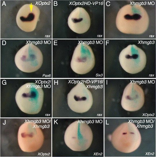 Fig. 6. Functional activity of Xhmgb3 in the anterior neural plate. An embryo (stage 13) (A), embryos (stages 17/18) (BâL). Embryos were injected with synthetic RNAs and/or Xhmgb3 MO as indicated at the top of each panel (AâL). Expression of rax (A, B, C, F, G and H), Pax6 (D), Six3 (E), XOptx2 (I and J) or XEn2 (K and L). The injected side is indicated by β-gal activity in blue (BâL) or by a yellow arrow (A).