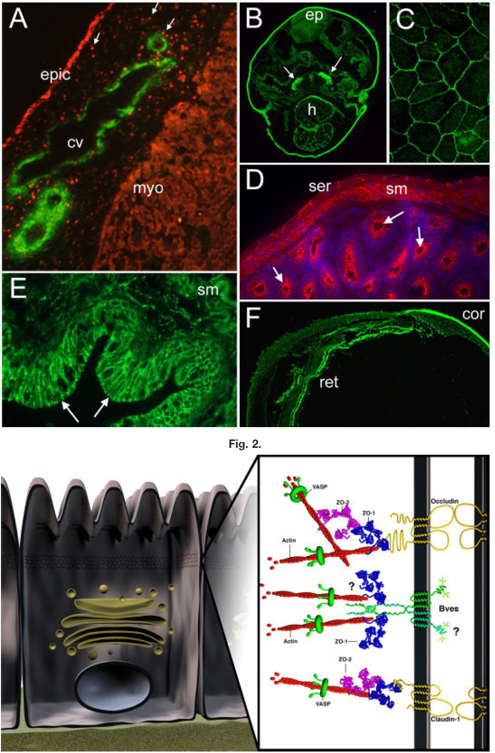 Fig. 2. Bves expression in muscle and epithelia. A: B846 polyclonal immunoreagent detects Bves (red) in the epithelial epicardium (epic), delaminated